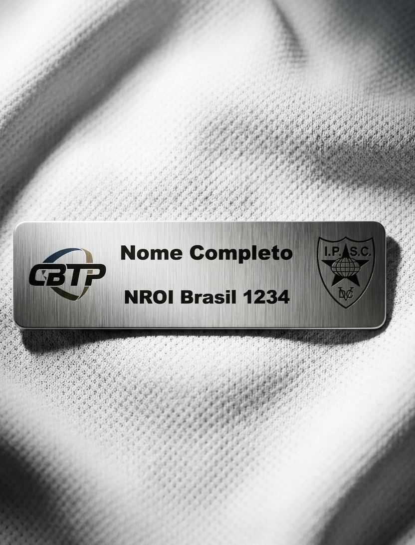 Cracha de identificação profissional em aço inox escovado, desenvolvido especialmente para Range Officers que desejam unir apresentação impecável e alta durabilidade no dia a dia de prova.